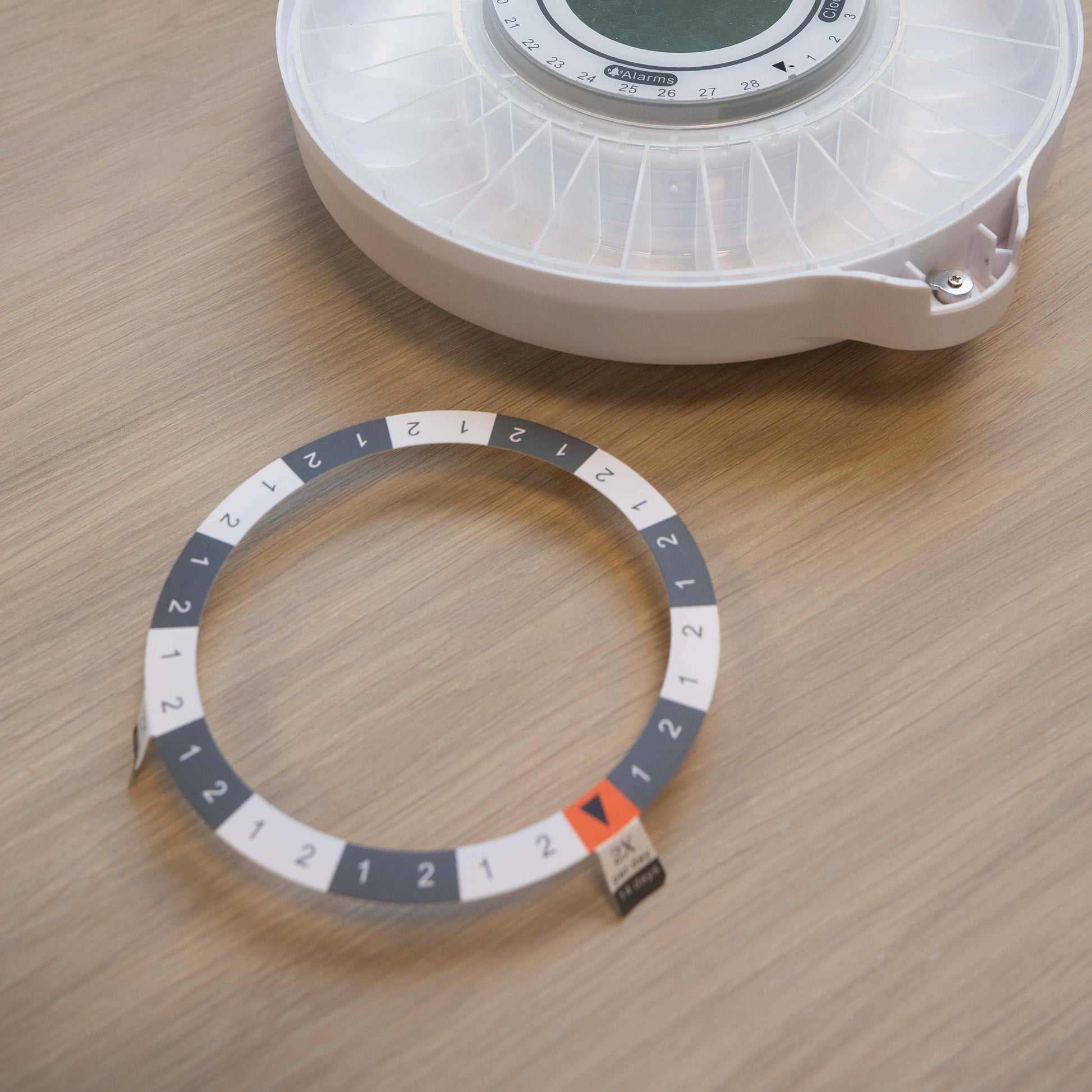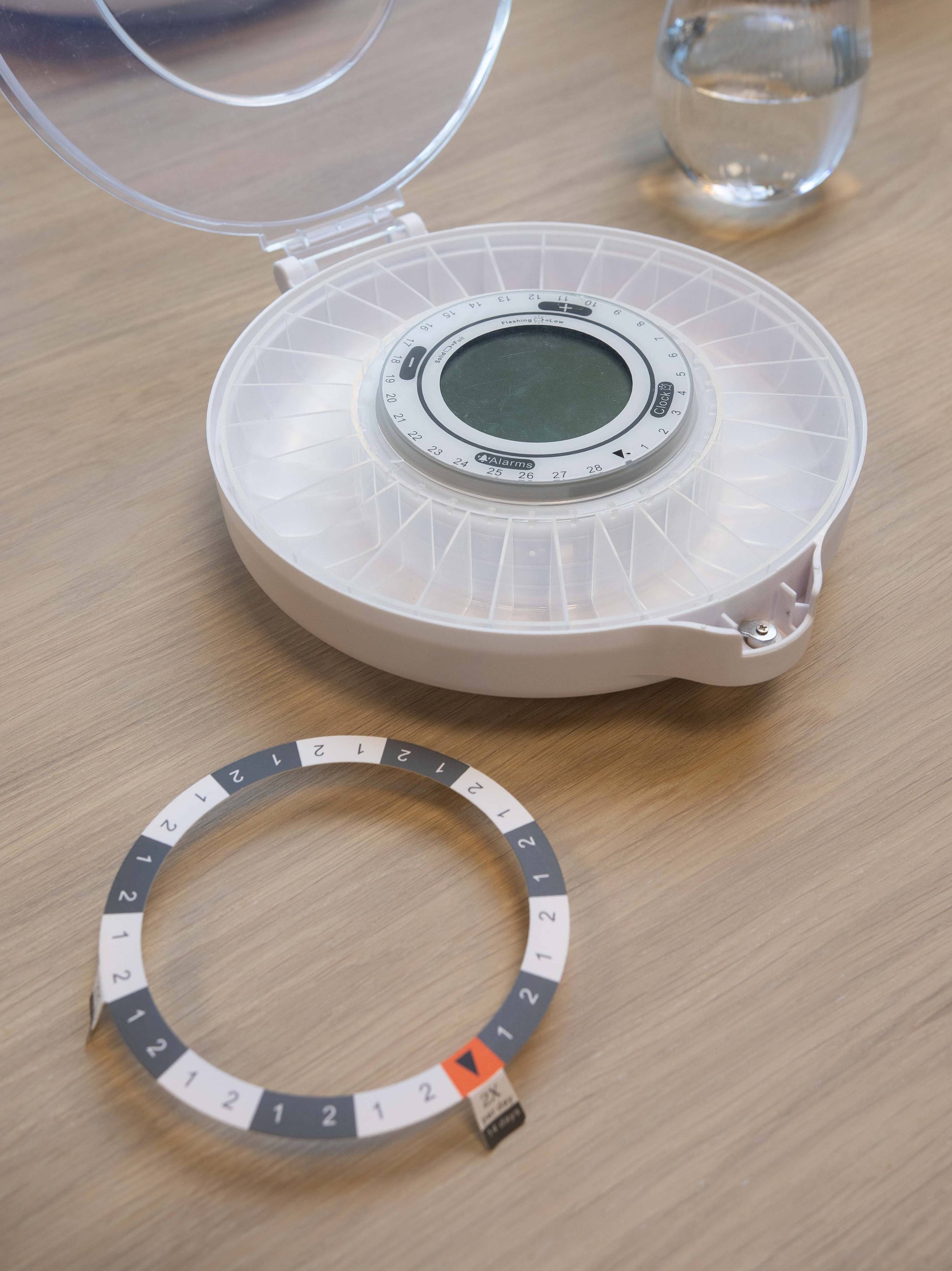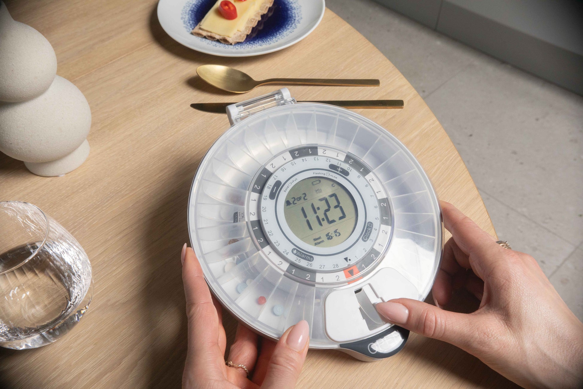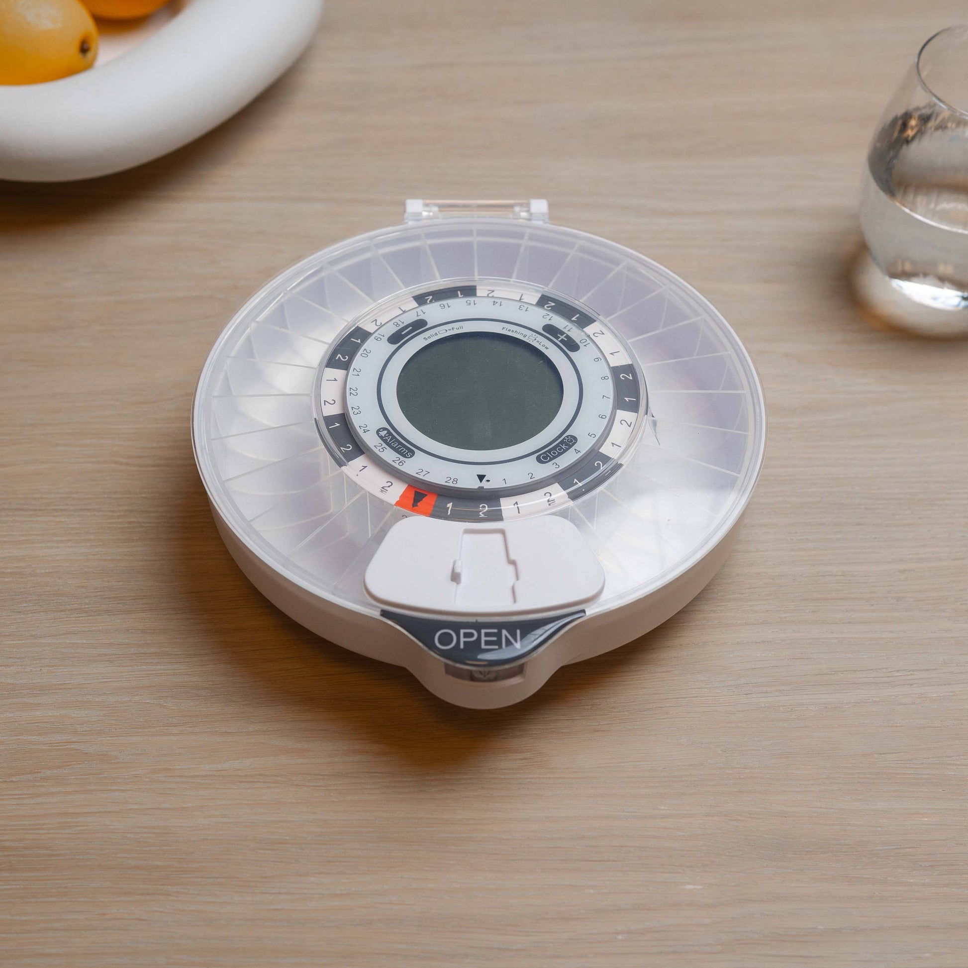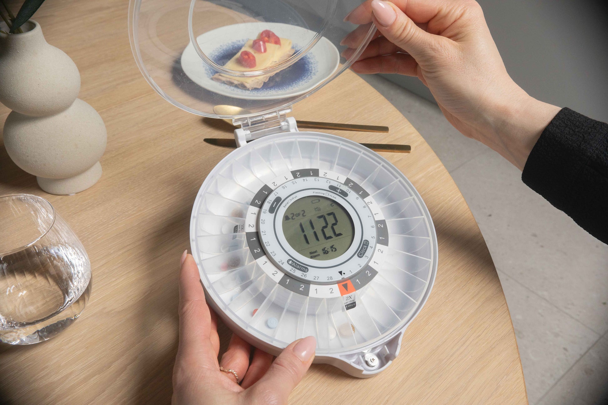 28 separate avlukk til medisiner. Gjennomsiktig lokk og automatisk åpning for å ta gjeldende medisin.